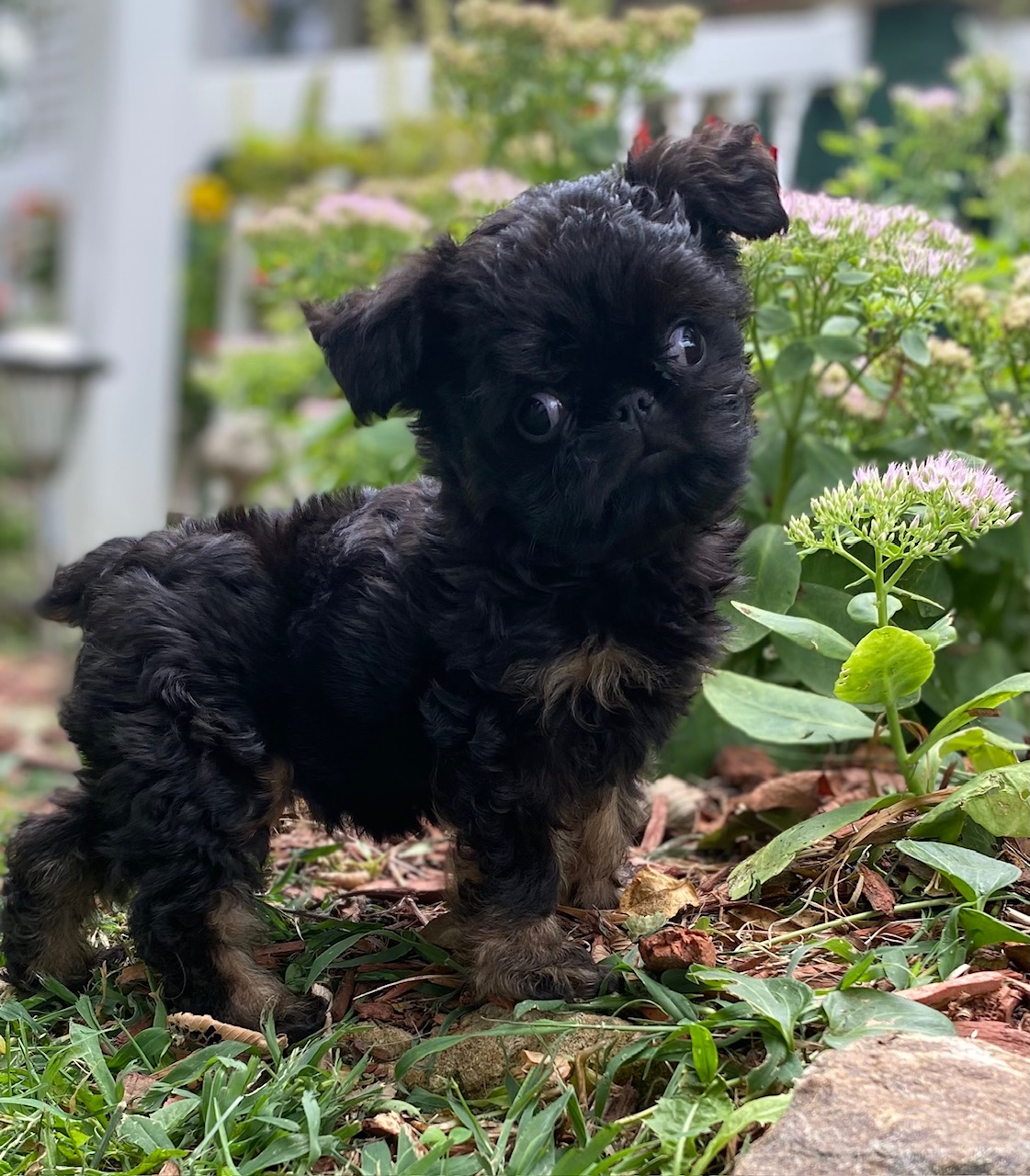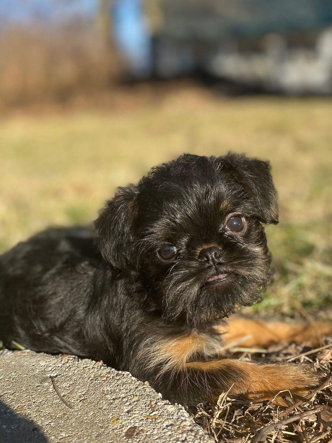 | Charlie is a gorgeous little boy born 6-10-24 out of Chari/Mike litter,he weighs 2lbs 6 ozs at 9 weeks so should mature around 8 lbs.Charlie has a couple of issues one of which is lazy eye as you can see in pic,and 2 he also has Nystagmus he was deemed healthy in every way at vet check,but will go to his new home with the new family knowing he has these 2 problems,will that shorten his life no he should have a long life like any other Griff,but he might have sight issues as he gets older the vets just don't know as they've never seen one born with both these issues.Charlie acts just like any other puppy ,plays crazy like any other puppy,and loves to give loving like any other baby,he is brave,and crazy! $1250 |  |